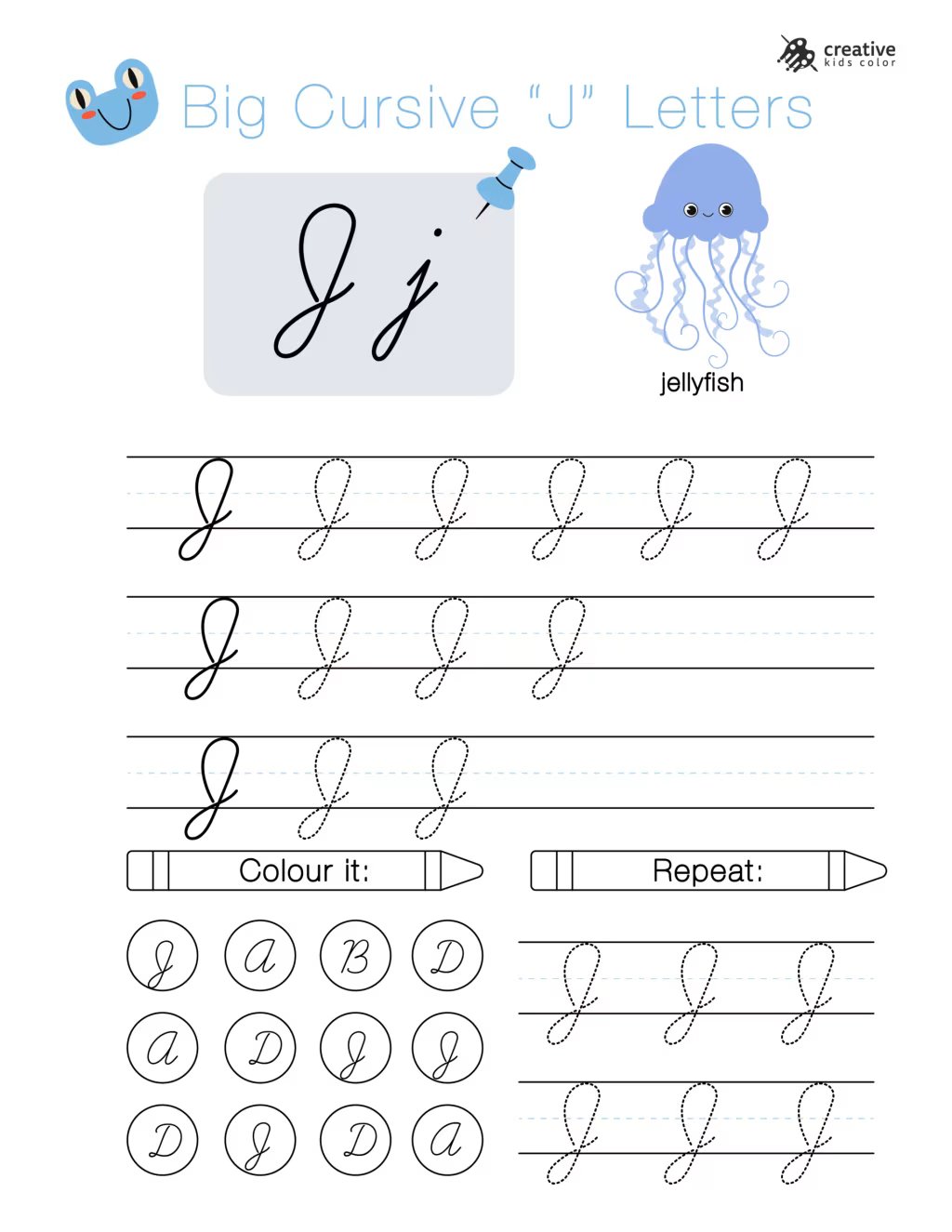 Start Big, Go Smaller: Start with the Big Cursive Letters “J” worksheet to master the shape and movement before moving on to smaller handwriting.